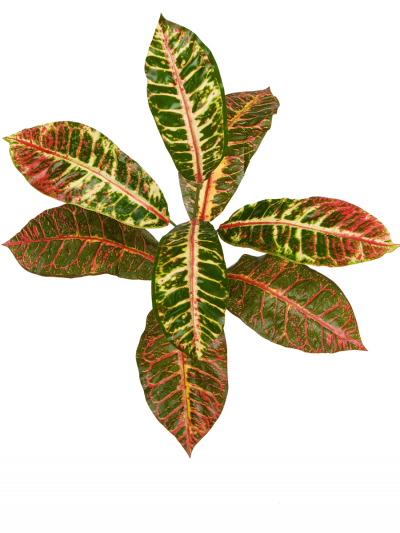 Der Crotonbusch fällt durch seine großen sattgrünen Blätter auf. Diese sind gelb und orange geädert und gestreift.